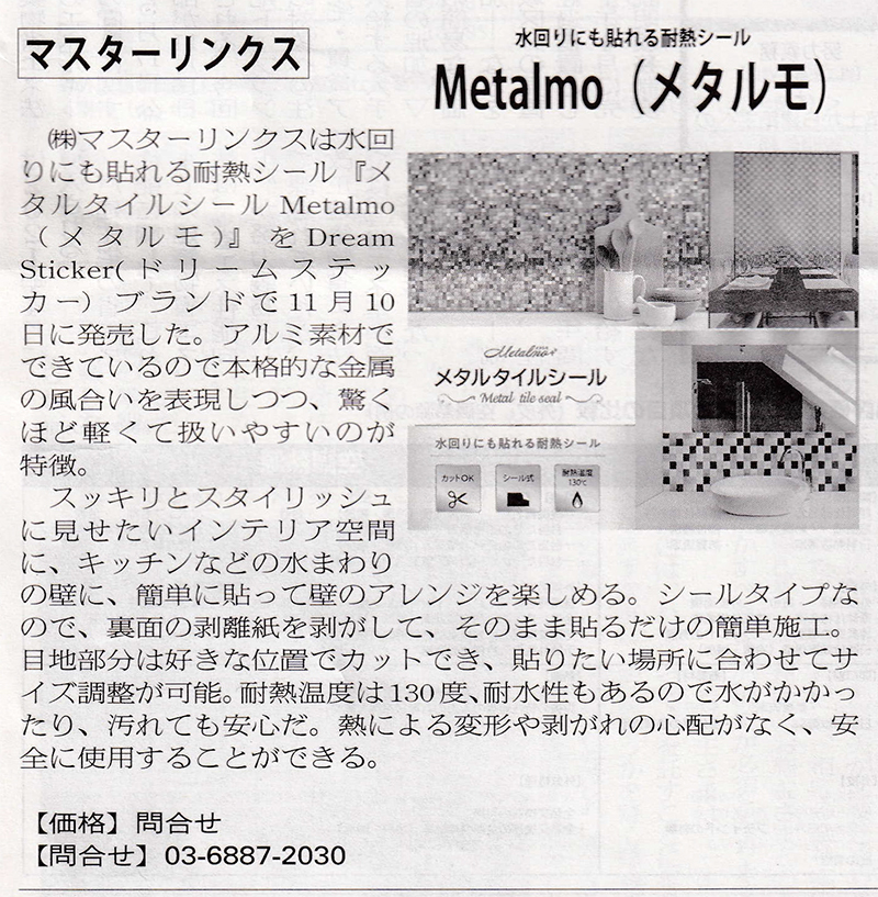 弊社ECサイト、ウォールステッカー専門店『Dream Sticker』の、メタルタイルシール「Metalmo」(メタルモ)が、日本住宅新聞 2019年11月15日号に掲載されました。